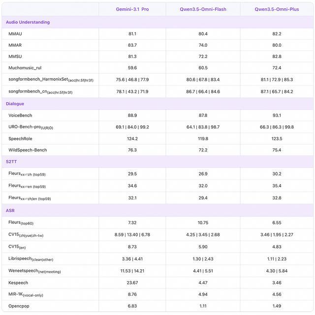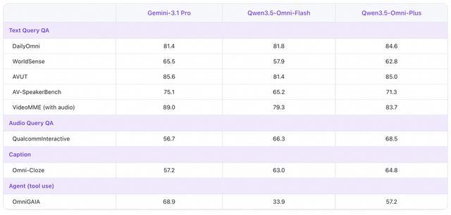 215 项 SOTA 霸榜,在音频及音视频分析、推理、对话、翻译等任务超过 Gemini3.1-Pro;