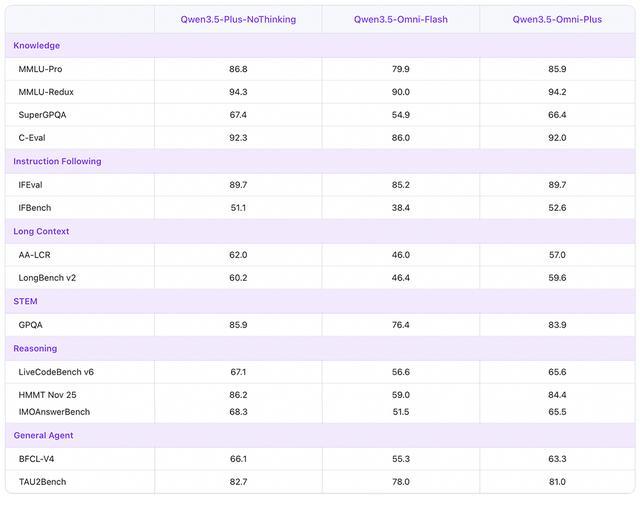 其中,通用音频理解、推理、识别、翻译、对话全面超越 Gemini-3.1 Pro,音视频理解能力总体达到 Gemini-3.1 Pro 水平。同时,视觉和文本能力与同尺寸 Qwen3.5 模型持平。